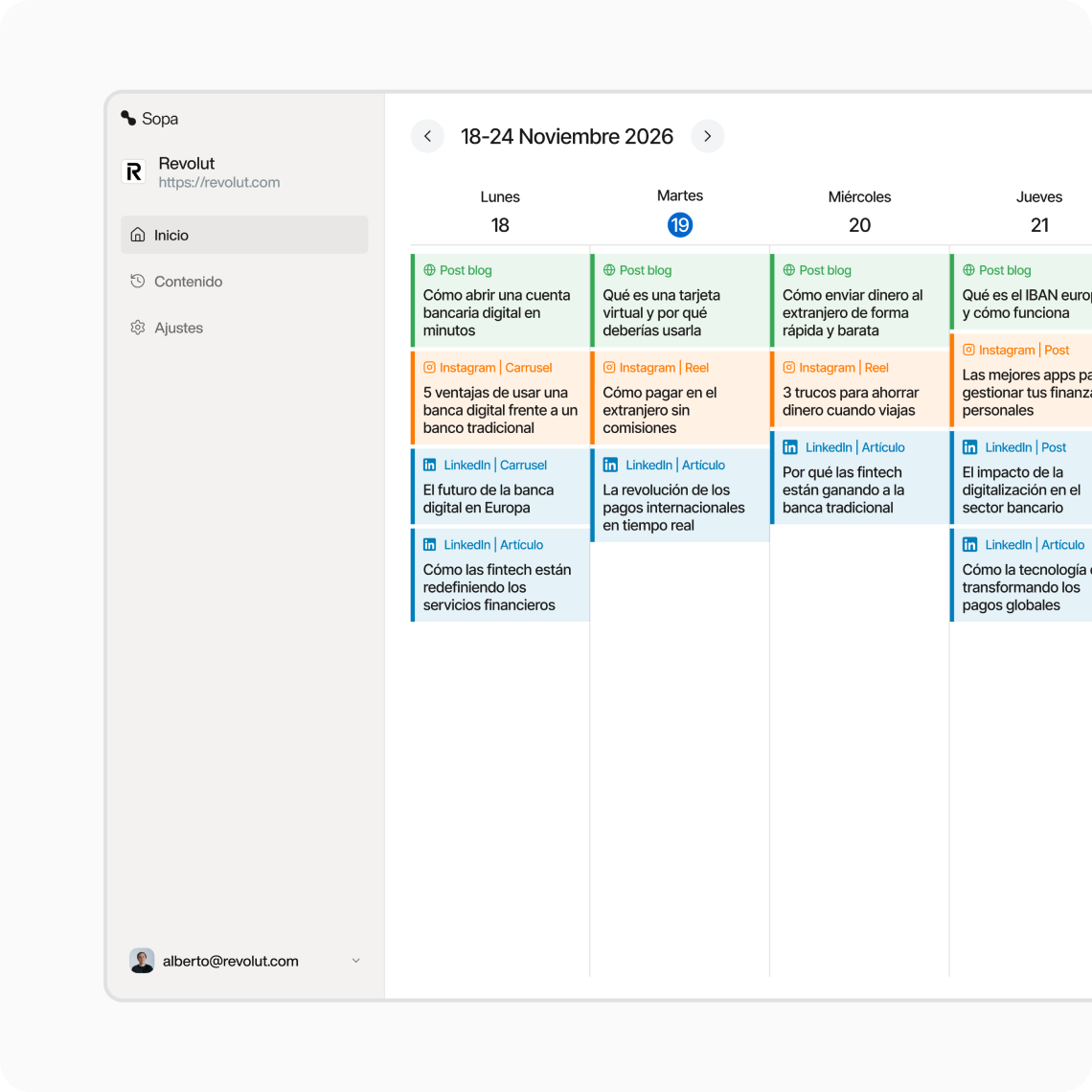 Sopa publica contenido diariamente en distintos canales para aumentar tu visibilidad y generar demanda de forma constante.